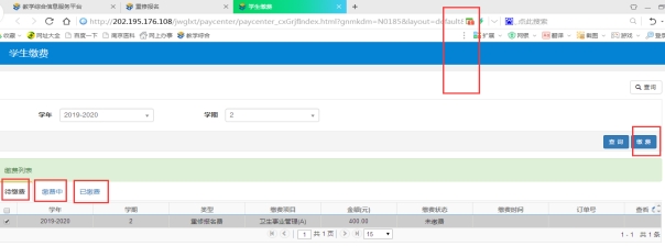 (3)点击缴费后的页面可查询待缴费/缴费中/已缴费课程,选择待缴费记录——点击缴费;(提醒:如缴费窗口被拦截,点击允许弹出!如缴费不成功,选课记录会跳转至“缴费中”,需返回学生缴费界面,先点击“缴费中--撤销订单”后再点击“待缴费”,继续完成缴费。如取消报名,则在撤销订单后返回报名界面,点击“退报”,取消报名。)