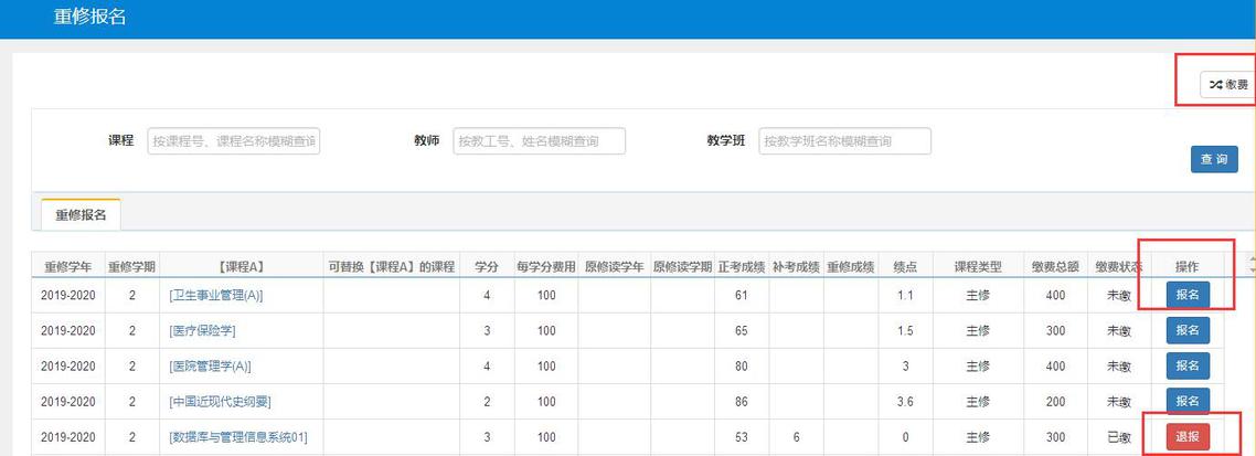 (2)选择需要报名的课程或搜索课程名称进行查询——点击报名或退报——点击右上角缴费;